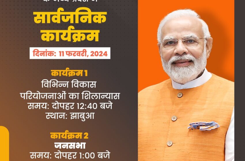 उन्होंने बताया कि निर्धारित कार्यक्रम के अनुसार, प्रधानमंत्री मोदी का प्रातः 11:30 बजे वायुसेना के विशेष विमान से इंदौर आगमन होगा। वे दोपहर 12:20 बजे इंदौर से हेलीकॉप्टर द्वारा झाबुआ जिले के गोपालपुरा में आयोजित कार्यक्रम में शामिल होंगे और लगभग 7500 करोड़ रुपये की विकास परियोजनाओं का लोकार्पण और शिलान्यास करेंगे। प्रधानमंत्री मोदी स्वामित्व योजना के लाभार्थियों को 1.75 लाख अधिकार अभिलेख वितरित करेंगे। इससे लोगों को उनकी जमीन के अधिकार के लिए दस्तावेजी साक्ष्य उपलब्ध हो जाएंगे। प्रधानमंत्री झाबुआ में ‘सीएम राइज स्कूल’ का शिलान्यास भी करेंगे। कार्यक्रम में मुख्यमंत्री डॉ. मोहन यादव एवं भाजपा के प्रदेश अध्यक्ष विष्णुदत्त शर्मा विशेष रूप से उपस्थित रहेंगे।